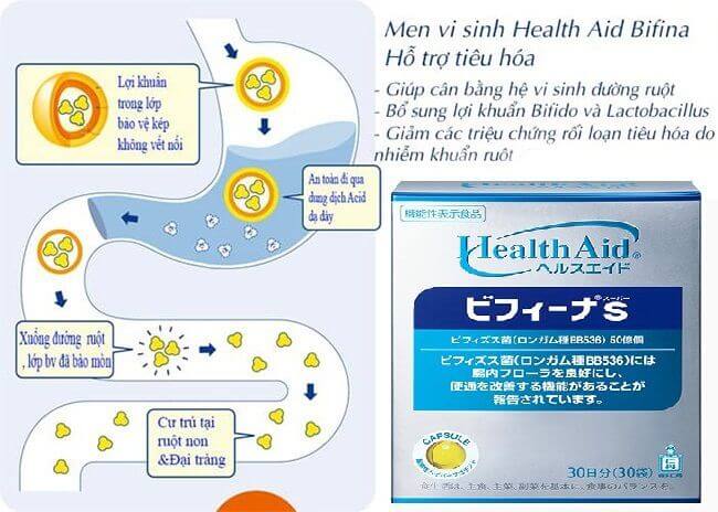 - Men vi sinh Health Aid Bifina S của Nhật giúp cân bằng hệ vi sinh đường ruột, bổ sung lợi khuẩn Bifido và Lactobacillus cùng chất xơ Oligosaccharide giúp hệ tiêu hóa khỏe mạnh và hoạt động tốt.