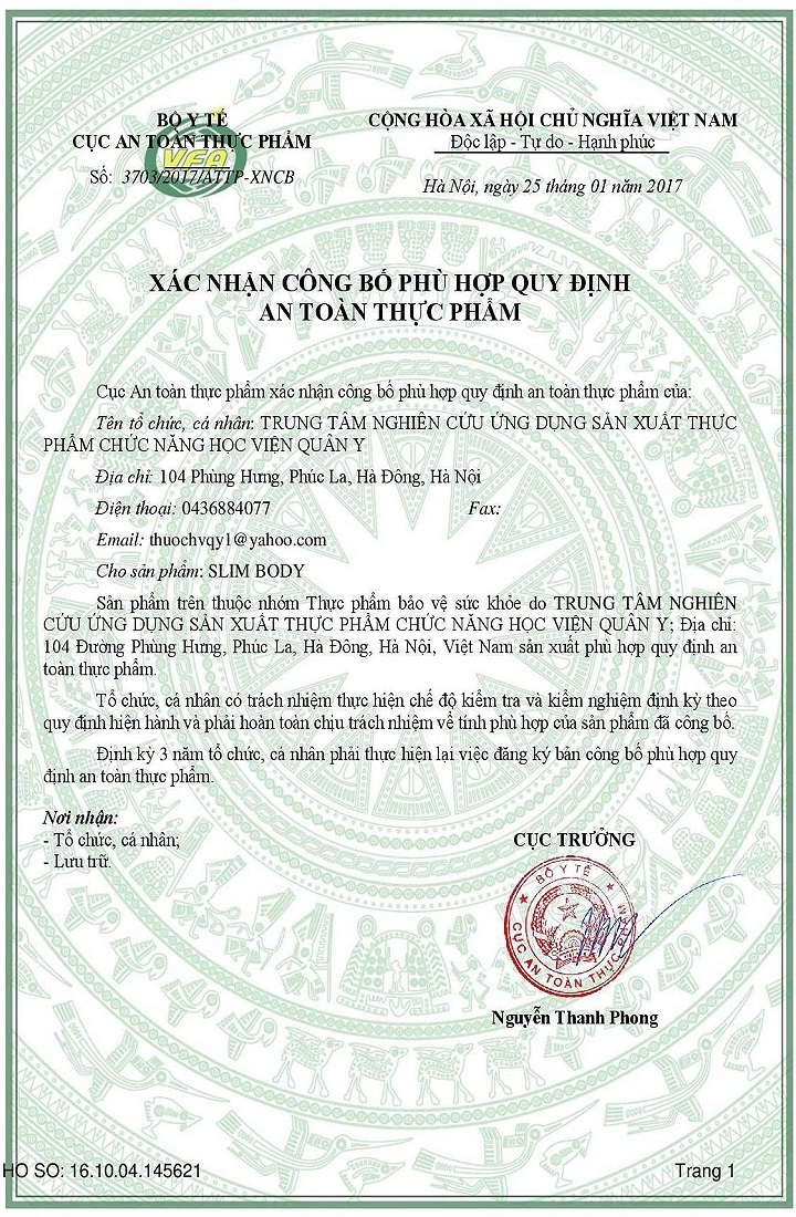 Khi nghe đến tên Học Viện Quân Y là mình đã tin tưởng ngay rồi. Mình còn tin tưởng và chắc chắn hơn nữa khi mình thấy sản phẩm đã được Bộ Y Tế - Cục An Toàn Thực Phẩm cấp giấy phép an toàn thực phẩm.