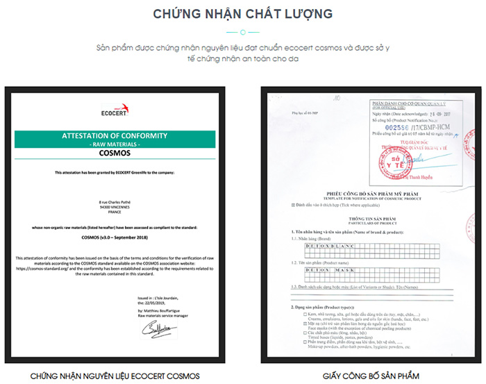 Mặt nạ thải độc Detox BlanC đã được chứng nhận dạt chuẩn Ecocert Cosmos và được Sở Y Tế chứng nhận và cấp phép an toàn cho da, được phép lưu hành trên thị trường.